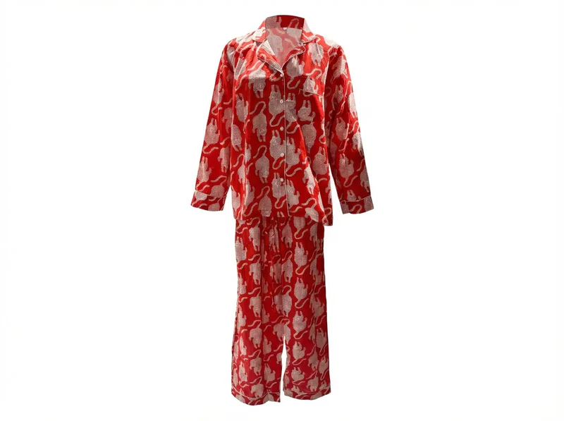Playful yet polished, the Scarlet Safari Pajama Set reimagines classic sleepwear with bold personality. Featuring an all-over ivory feline-inspired print set against a vibrant red backdrop, this two-piece set delivers eye-catching charm with timeless tailoring.