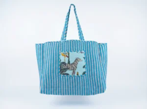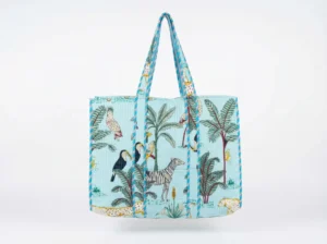 Step into a world of tropical adventure with the Azure Safari Quilted Tote. Set against a soft sky-blue backdrop, this beautifully illustrated design features exotic wildlife—including zebras, leopards, and vibrant birds—nestled among lush palm trees and botanical details.