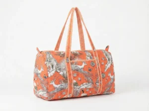 Vibrant and full of wanderlust charm, the Coral Safari Escape Duffle Bag is designed for stylish getaways. Set against a lively coral backdrop, intricate wildlife illustrations—featuring majestic tigers, graceful antelope, exotic birds, and fluttering butterflies—create a beautifully detailed, storybook-inspired print.