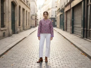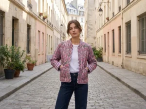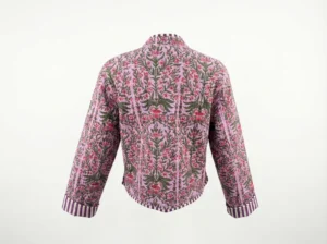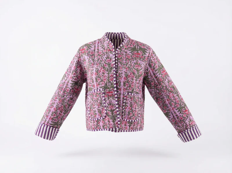Soft, romantic, and effortlessly elegant, the Lavender Meadow Quilted Jacket brings timeless florals to life. Delicate pink blossoms and leafy green vines bloom across a gentle lavender backdrop, creating a beautifully balanced, feminine design.