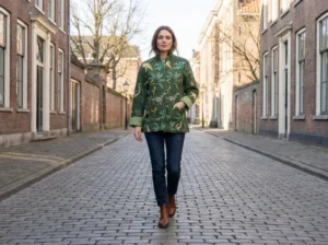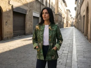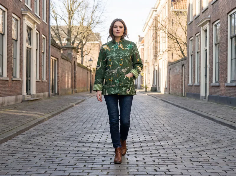 Bring bold adventure to your everyday wardrobe with the Emerald Safari Quilted Jacket. Crafted in a rich forest-green hue, this statement piece features intricate jungle-inspired prints with leopards, zebras, tropical birds, and lush palm trees woven throughout. The lightweight quilted texture adds subtle structure and warmth, making it perfect for transitional weather.