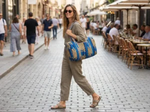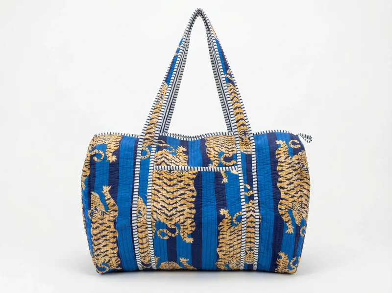Striking and sophisticated, the Midnight Safari Quilted Duffle Bag blends bold design with everyday practicality. Featuring golden tiger motifs set against rich shades of deep navy and vibrant blue stripes, this eye-catching bag brings a refined wild touch to your travel essentials.