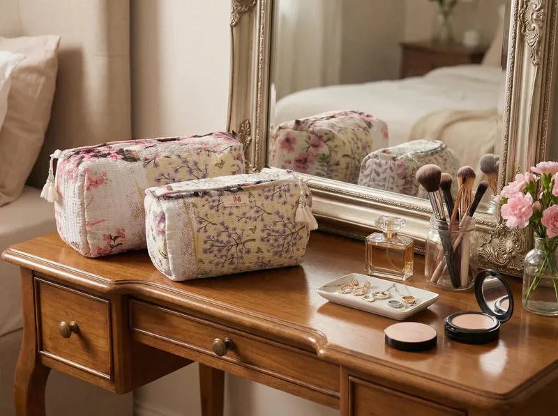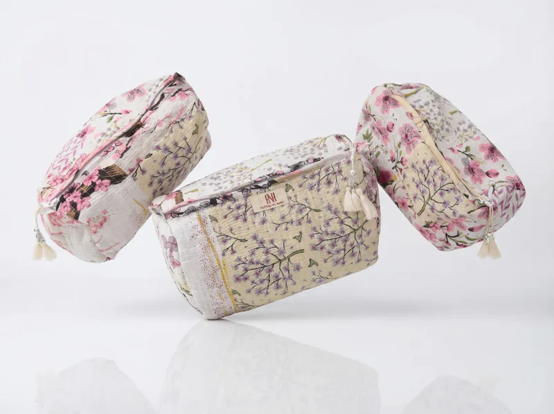 Crafted from lightweight quilted cotton with gentle padding, each pouch offers structure and protection while remaining soft and flexible. The trio includes three versatile sizes — perfect for cosmetics, toiletries, travel essentials, or handbag organization. Finished with coordinating zip closures and delicate tassel details, these pouches combine practicality with timeless feminine style.
