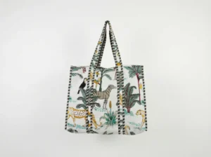 Inspired by the beauty of the wild, the Ivory Safari Quilted Tote features an elegant jungle scene set against a soft ivory backdrop. Detailed illustrations of zebras, leopards, tropical birds, and lush greenery create a refined yet playful design that brings adventure to everyday style.