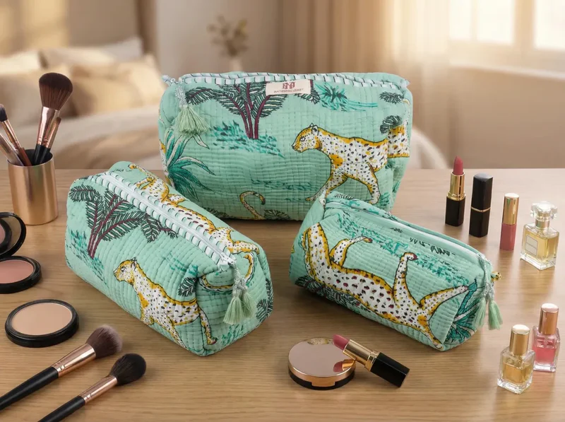 Fresh, playful, and effortlessly practical, the Sage Savannah Quilted Travel Pouch Trio brings a soft jungle charm to your everyday essentials. Set against a calming sage green backdrop, graceful wild cats and tropical foliage create a serene yet adventurous print.