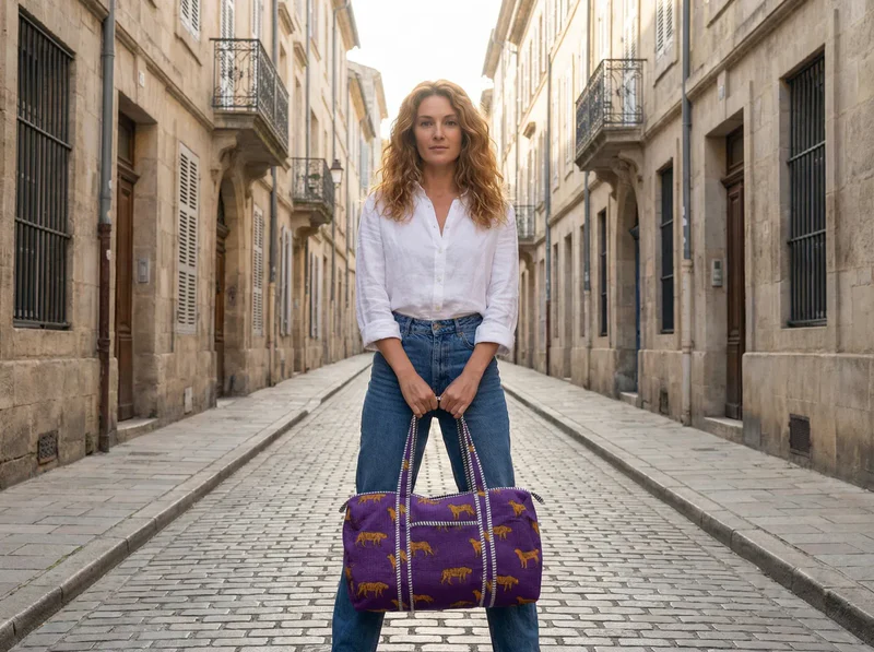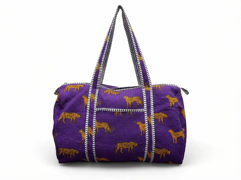 old, vibrant, and adventure-ready — the Royal Safari Quilted Duffle Bag makes a striking statement wherever you go. Featuring a rich purple backdrop adorned with golden leopard motifs, this eye-catching duffle blends playful luxury with everyday practicality.