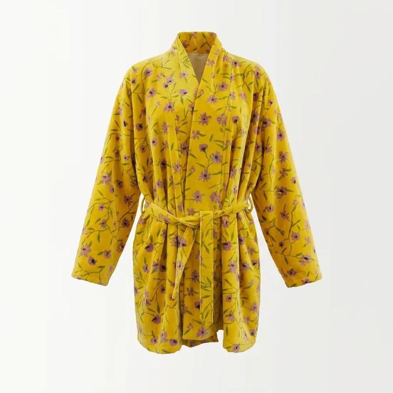 Brighten your loungewear with the short Yellow Mustard Meadow Velvet Wrap Robe, a beautifully soft piece designed for comfort and effortless style. Crafted from plush velvet, this robe features a vibrant golden-yellow background adorned with delicate scattered floral motifs in soft pastel tones. The classic wrap design with a matching waist tie and relaxed long sleeves creates a flattering and comfortable fit. Perfect for cozy mornings, relaxed evenings, or layering as a chic house robe, it combines cheerful color with luxurious texture.