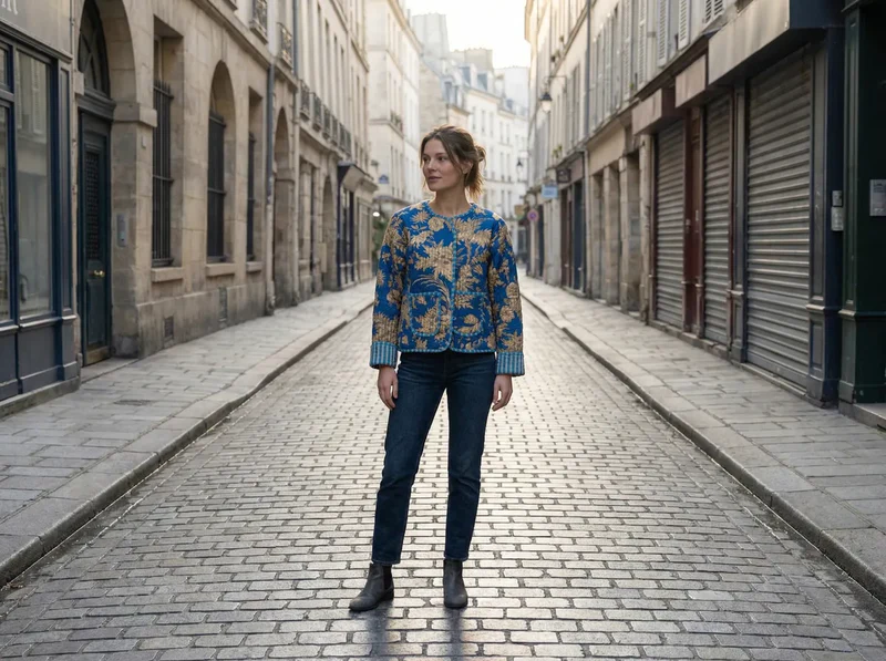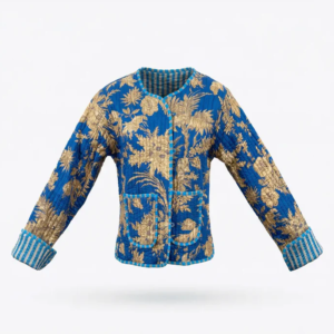 Rich, vibrant, and effortlessly elegant, the Royal Indigo Botanica Quilted Jacket is designed to make a statement. Featuring an intricate golden botanical print set against a striking indigo-blue backdrop, this piece blends bold color with timeless artistry.